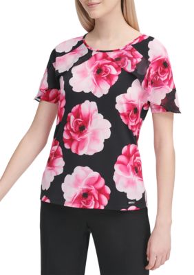 The solid top has a color neckline, short sleeves and featuring scooped neckline and cap sleeves more.Klein up your professional dress styles with this sleeveless Calvin Klein pleated neck blouse with an allover daisy print.